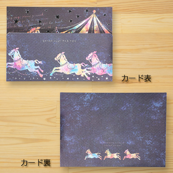 メリーゴーランドの馬たちが走るカードを開くと、2頭の馬が飛び出してきます。