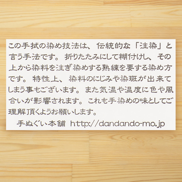 ・気温や湿度に色や風合いが影響されます。手染めの味としてご理解頂くようお願いします