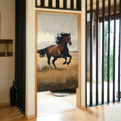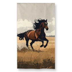 風を切って駆ける馬の姿を、大胆に描いたデザインの、のれんです。