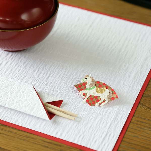 一枚ずつ丁寧に仕上げられた、馬の和紙切り絵パーツ。扇のような広がりを見せる縁起の良い背景に白馬がりりしく立つ佇まいが素晴らしいです。