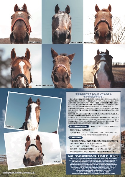 北海道から鹿児島まで、全国で余生を過ごすフォスターホースたち53頭の写真を収録。放牧地を駈ける姿、仲良し2ショット、のんびりくつろいだ表情など、個性あふれる馬たちの表情をぜひお楽しみください!グラビアページには、メイショウドトウとノーザンレイク様のメトさんのツーショットを掲載!(FH撮影/朝内大助・田中愛莉)