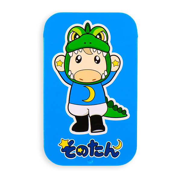 園田競馬の人気キャラクター「そのたん」の、スライド式のミニ缶ケースです。鮮やかな青空色のフタに、怪獣着ぐるみのそのたんが元気いっぱいに登場。このイラストは、そのたんを身近で見守る方が丁寧に描き下ろした特別デザインです。愛らしい表情やポーズがとってもそのたんっぽくていいですね!